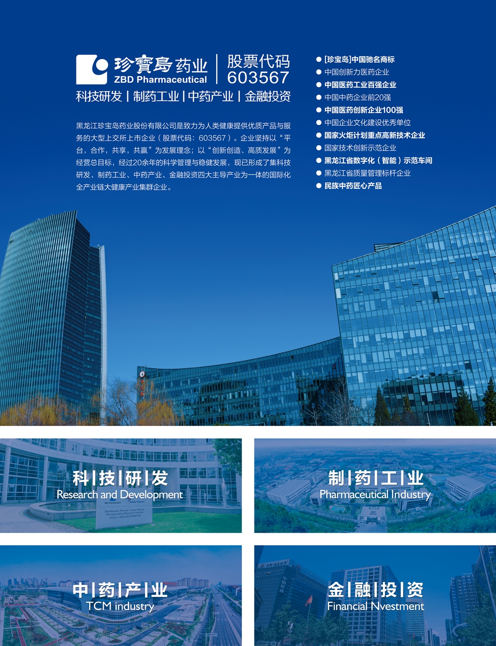 黑龍江珍寶島藥業股份有限公司(603567.SH)創立于1996年。公司以“為世界提供優質健康產品與服務”為企業使命,以“平臺 合作 共享 共贏”為發展理念,堅持“一心三園四平臺”發展戰略,以“六位一體”運營模式推動企業經營轉型。打造醫藥行業新質生產力的重要平臺,加快科技研發成果轉化與應用,積極參與國家醫藥產業項目建設。珍寶島藥業長期穩居中國醫藥工業百強、中國中藥企業前二十強行列。業務領域涉及科技研發、制藥工業、中藥產業、金融投資四大板塊。