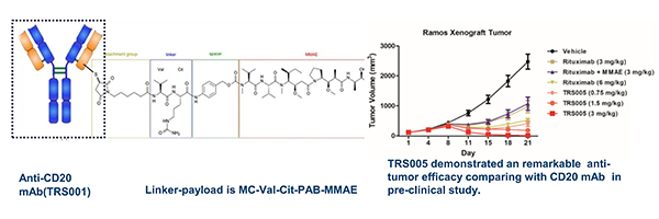 據(jù)了解,TRS005是由浙江特瑞思藥業(yè)股份有限公司自主研發(fā)的抗CD20-ADC藥物,獲得國(guó)家“十二五”和“十三五”重大新藥創(chuàng)制專項(xiàng)資金滾動(dòng)支持,非臨床實(shí)驗(yàn)結(jié)果表明其療效優(yōu)異,1/8劑量即可達(dá)到與利妥昔單抗一致的腫瘤抑制效果。