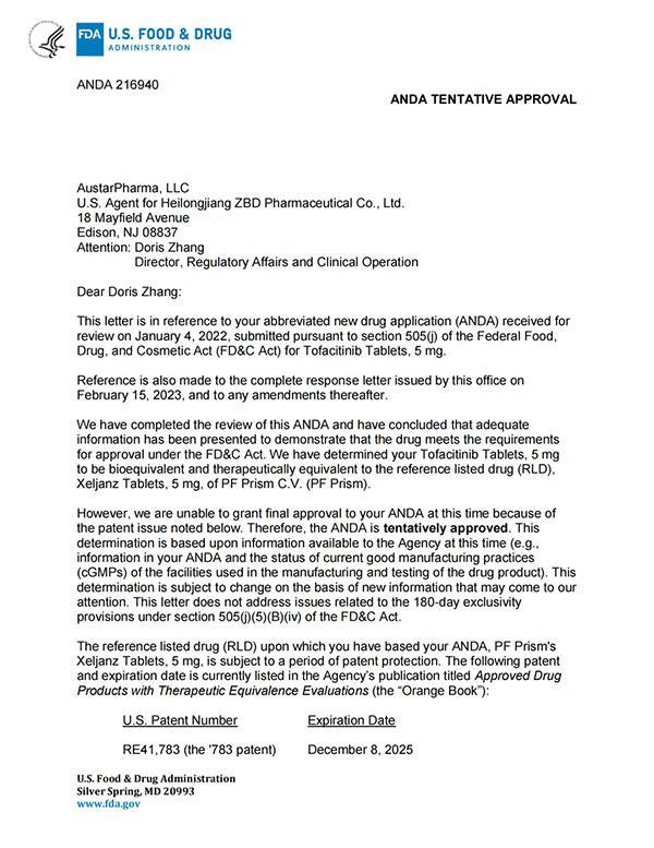 5月26日,珍寶島藥業(yè)發(fā)布公告,公司收到美國(guó)食品藥品監(jiān)督管理局(簡(jiǎn)稱“美國(guó)FDA”)的通知,珍寶島藥業(yè)向美國(guó)FDA申報(bào)的枸櫞酸托法替布片的新藥簡(jiǎn)略申請(qǐng)(ANDA,即美國(guó)仿制藥申請(qǐng))已獲得暫時(shí)批準(zhǔn)(暫時(shí)批準(zhǔn):指FDA已經(jīng)完成仿制藥的所有審評(píng)要求,但由于專利權(quán)或?qū)Yu權(quán)未到期而給予的一種批準(zhǔn)形式)。
