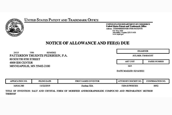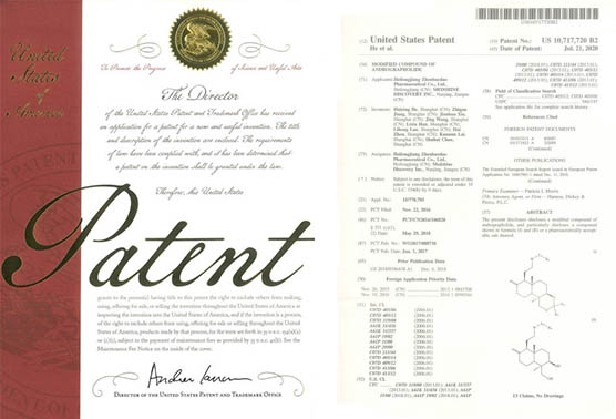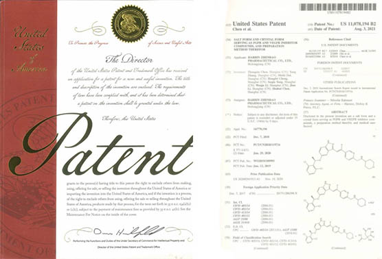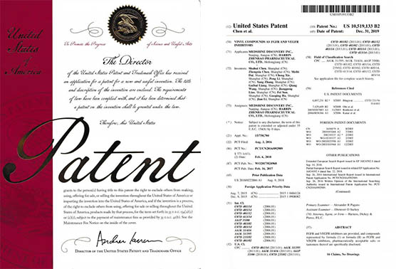 通過PCT途徑,創新藥在多個國家獲得專利授權,《作為FGFR和VEGFR抑制劑的乙烯基化合物》已獲得美國、歐洲、日本授權;《作為Akt抑制劑的二氫吡唑氮雜卓類化合物》已獲得美國、歐洲、日本、韓國授權;《作為Akt抑制劑的鹽型及其晶型》已獲得美國、日本、韓國和歐洲授權;《穿心蓮內酯改構化合物》獲得美國授權;《一種穿心蓮內酯改構化合物的鹽型、晶型及其制備方法》已獲得美國、歐洲授權;《一種作為FGFR和VEGFR抑制劑化合物的鹽型、晶型及其制備方法》已獲得美國、歐洲、日本授權。